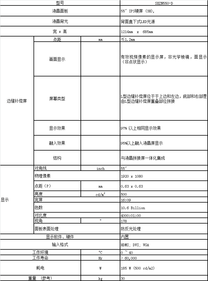 無縫液晶拼接屏SXZN550-D技術參數(shù)表: