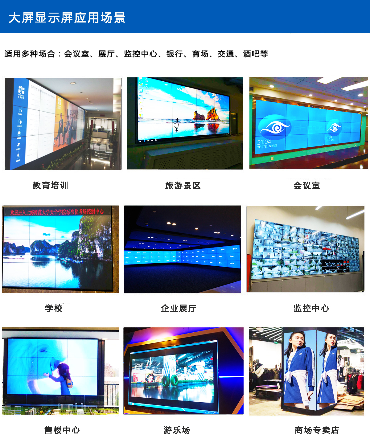 常見用用領域:大中小型會議室、企業展廳、舞臺、房地產、商用大屏廣告展示等。