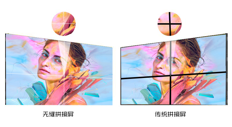 液晶屏正面沒有拼縫,以及沒有黑框線條,兩屏之間共用一整條邊縫補(bǔ)償屏跨接顯示,左邊縫補(bǔ)償屏覆蓋右黑框;上邊縫補(bǔ)償屏覆蓋下黑框。完全覆蓋屏與屏之間的安裝物理間隙;采用小點(diǎn)距邊縫補(bǔ)償顯示技術(shù)與液晶顯示單元的完美結(jié)合,使畫面整體性近似小間距LED產(chǎn)品,畫質(zhì)、分辨率、成本、色彩還原、維護(hù)等方面大大優(yōu)于小間距LED產(chǎn)品。